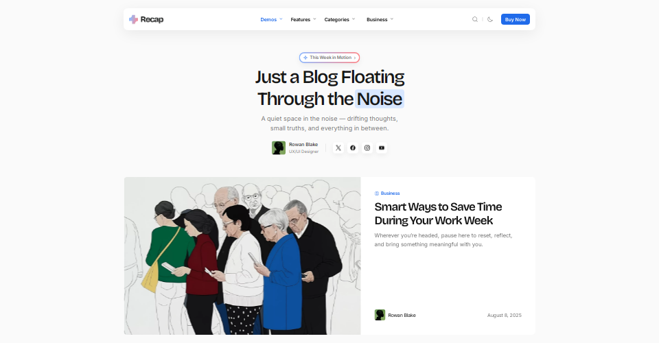 Recap is a sleek and contemporary WordPress theme crafted with storytellers in mind. Perfect for bloggers, writers, and editorial creators, this theme delivers a refined balance between design and readability. Fully compatible with WordPress 6.7+ and 6.8+, Recap ensures smooth performance and future-ready functionality.